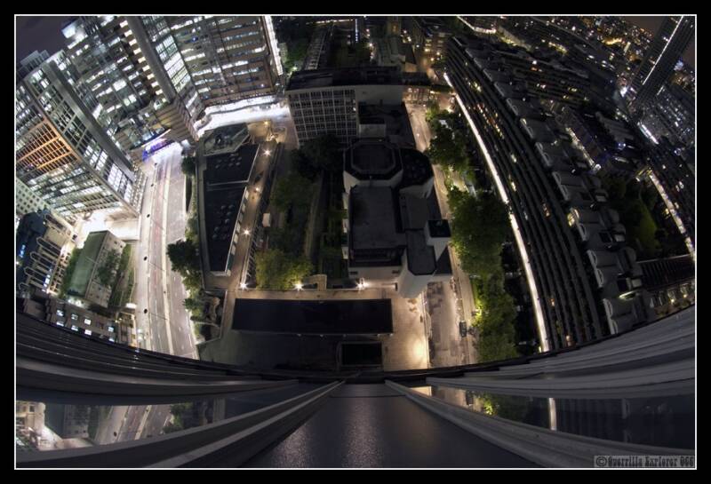 Some fisheye action, with the Heron dead centre piercing the skyline. On the left sits GES127 Fore St Exchange, soon to be turned to rubble.