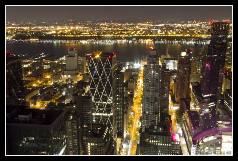 On the Western side, the Hudson River splits New York and New Jersey on the far bank. Columbus Circle buildings sit in the extreme bottom right corner, with the South tower of the Time Warner Centre behind it glowing with four red lights on the roof. The Norman Foster designed diamond façade building in the centre of the picture is the Hearst Tower, rising above the original 6-storey building it was built on top of.