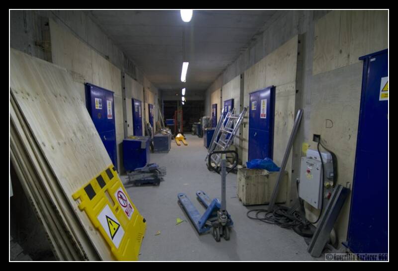 After having seen another explorer post an iconic photo on Facebook, I thought I'd have a go at producing something different as well up there. I decided to take my Fender guitar up there and packed it carefully into my backpack. As I arrived at the site, I bumped into media legend Bradley Garret, as well as LeMarc, and Silentmotion. They were with two guys who weren't explorers, I think they were graffiti guys. We had a catch-up chat, and then I went in where they had just exited. The easiest I've ever entered a construction site, lifting up a heras fence, and walking in. There was no security on site, so just an easy walk into the base of the core. The blue doors are for lift shafts. The stairs were on the left in this picture, around the back of the lifts.