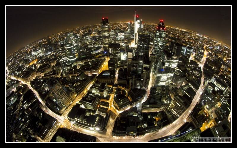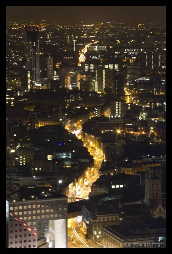 And West, with BT lighting the horizon. The roads converge to form spokes of a wheel by the Bank of England just below the centre of the picture.