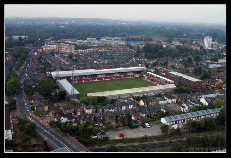 Home of the Bees, Brentford FC, Ealings only football club. The green strip of trees beyond the football ground are Syon Park and Kew Gardens. Beyond the trees is Richmond, and on the horizon, Richmond Park.