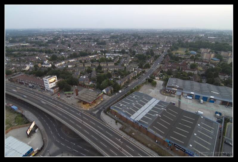 A wide shot of train (far left) and road heading West out of the city. Planes were starting to fly past to Heathrow in the distance.