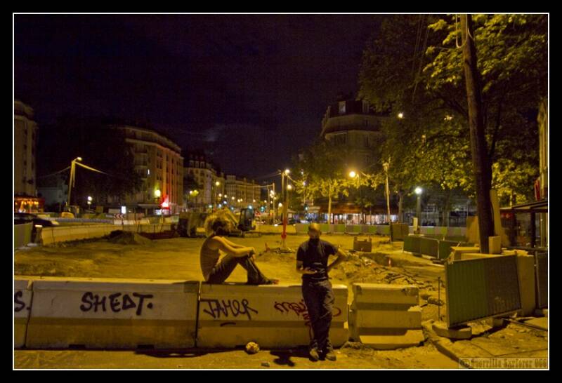 I caught up with Charlotte & Marc a few streets away. They both swore that there was someone just behind me on the ladders, but I disagreed, and the above photo concurs me thinks. It was then back to the Marcmobile. More tapping into the GPS, and Marc guided us off. However the sudden burst of running above his normal olympic medal winning walking speed, meant his lungs were unable to cope, and he began to cough rather strongly almost suffering for breath. So he pulled over. It seems most of Paris is being dug up to introduce tram routes. So we parked up next to an area that was being sorted out for the aforementioned tram, so Marc could sort his ailing body out.