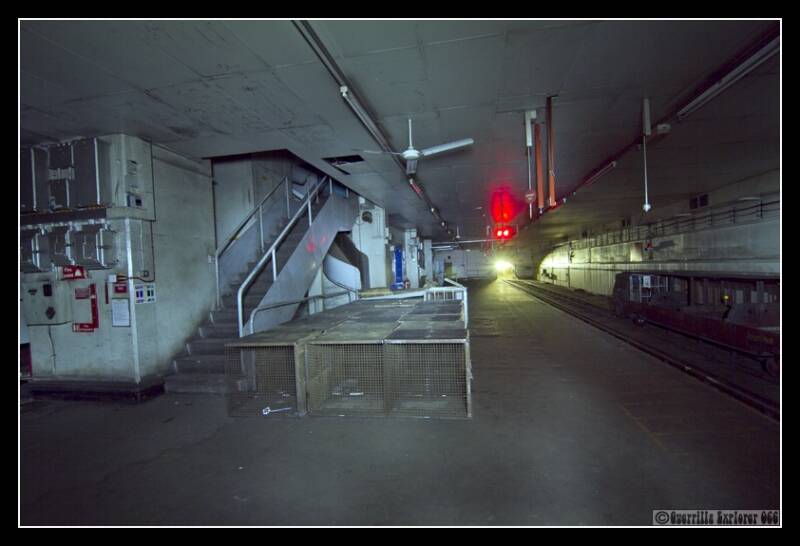 Connecting passage between platforms. Just up the platform one can see an alcove with a brief glimpse at the bricks that block it off from the building above.