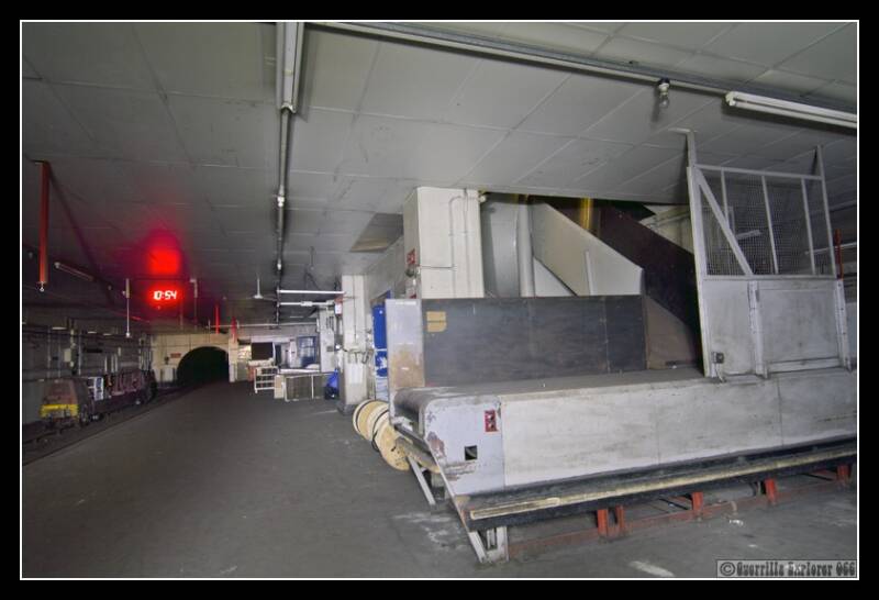 due to tiredness mainly, I gave up looking for the right light switch, and also due to the fact you could see into the station above through a mesh above the conveyor belts. So lights might give things away. This shot is looking East towards Mount pleasant.